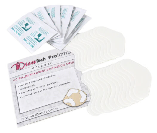 Go bra-less with Breast Form V-Tapes! V-Tapes are made from double-sided medical adhesive that’s skin-safe and reusable. After each use, simply clean the adhesive surface with Skin Tac wipes (included) and wear them again!
