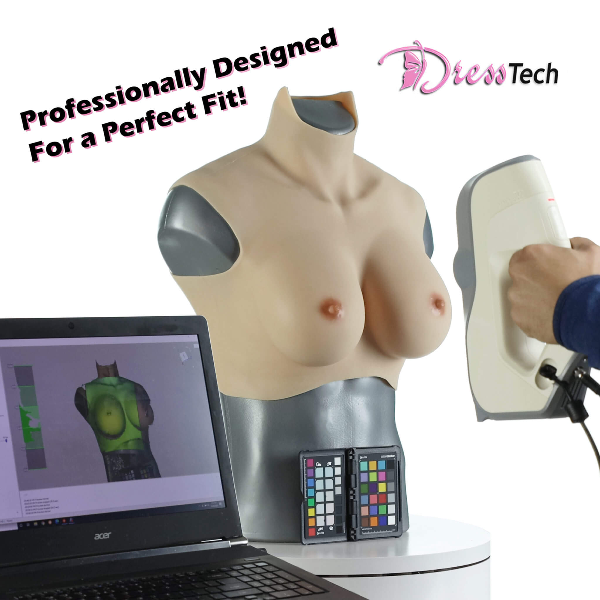 Computer-Designed – DressTech is proud to sell one of the only silicone breast plates that’s designed from the ground-up, to fit and feminize the male torso. Other breast plates are copied from female mannequins; a shortcut that creates fit issues for genetic males. In contrast, the DressTech Proform breast plate was developed from male 3D body scans for an improved fit, including a wider neck and shoulders.
